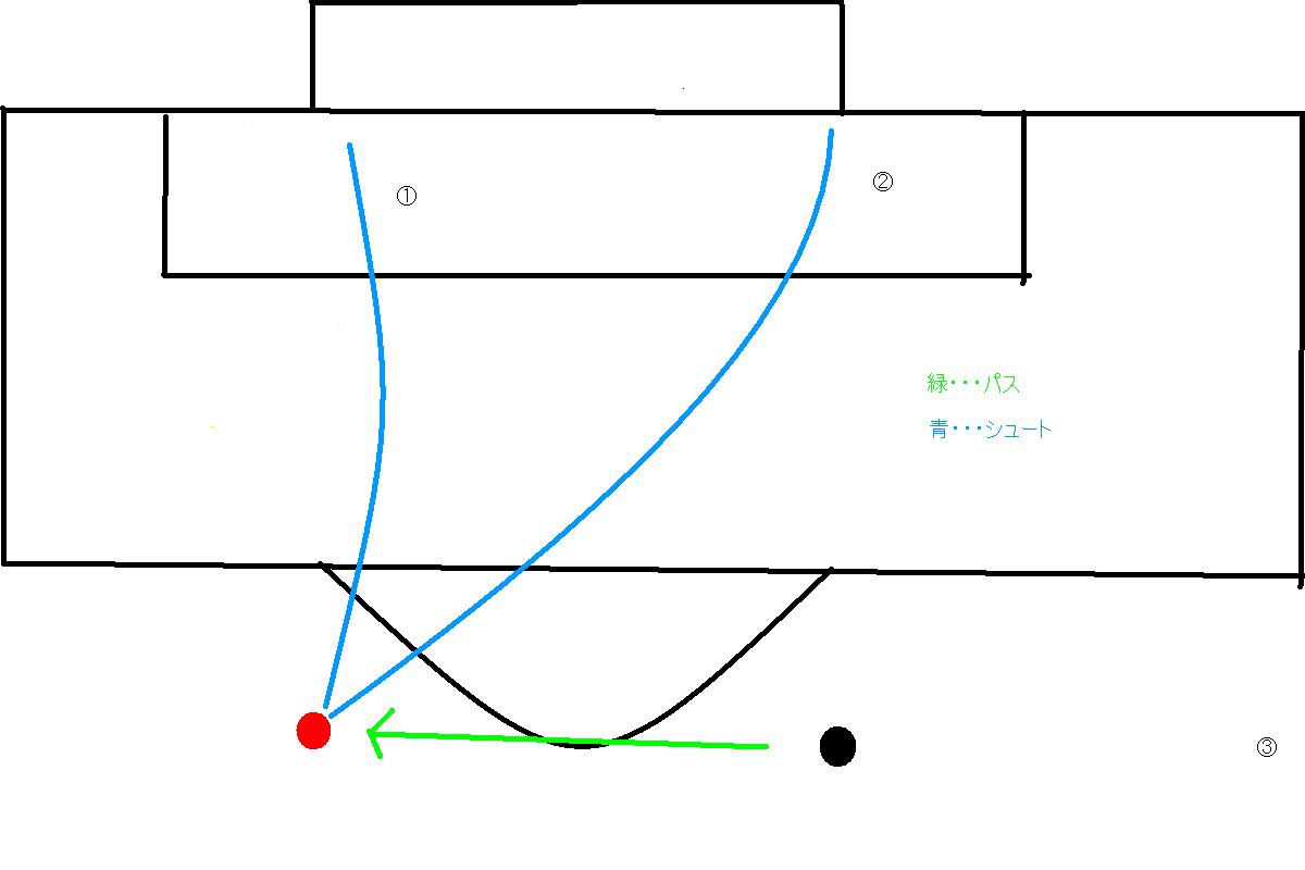 あと、決まる確率は低いですが③のあたりからロングパスを使っても同じことができます。まぁショートパスでもできるんですがロングだと余計にかっこいいですね