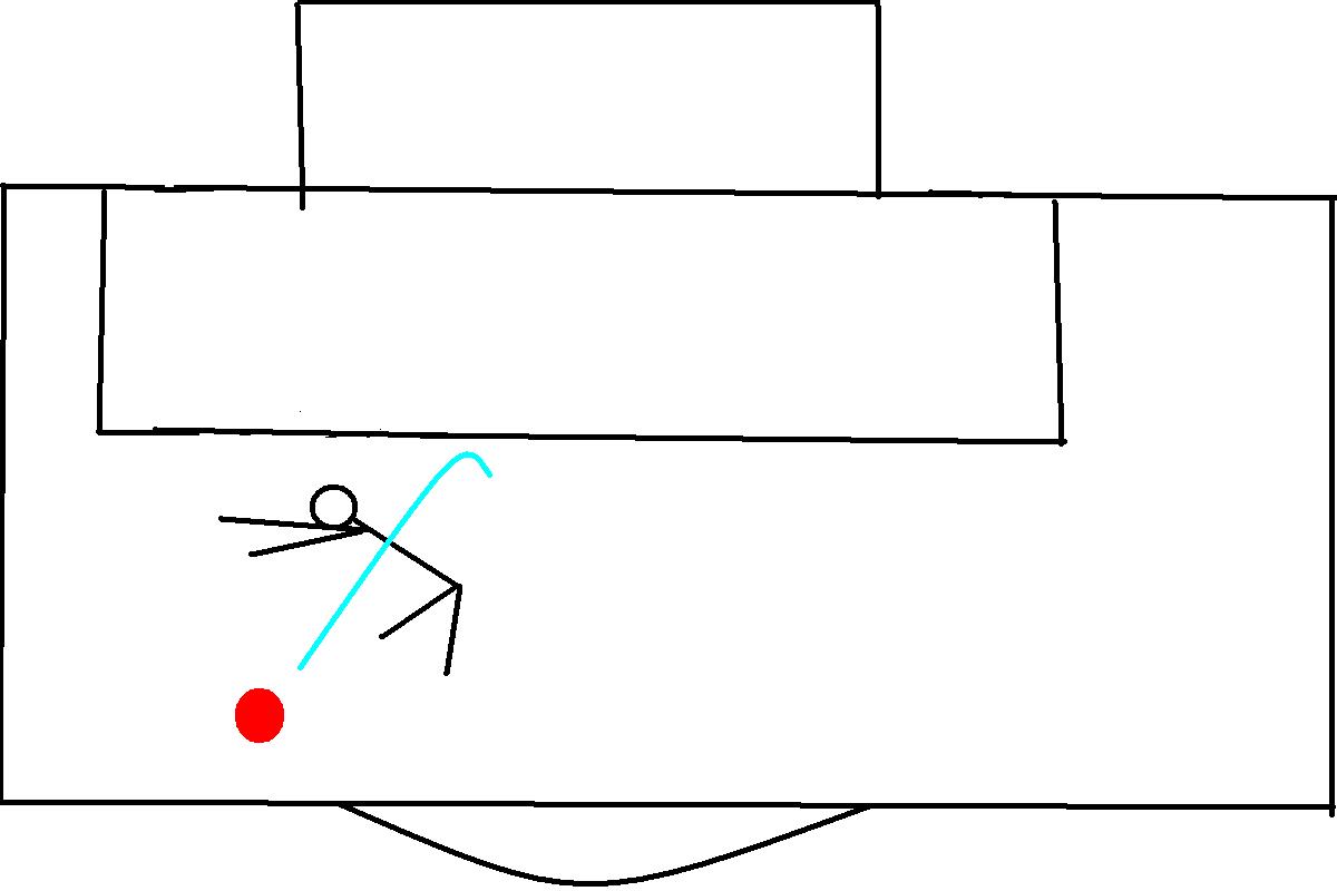 この絵ではボールがわき腹の上あたりを通過していますが足を狙うとたいていこのあたりを通ります。ここでいいんです。